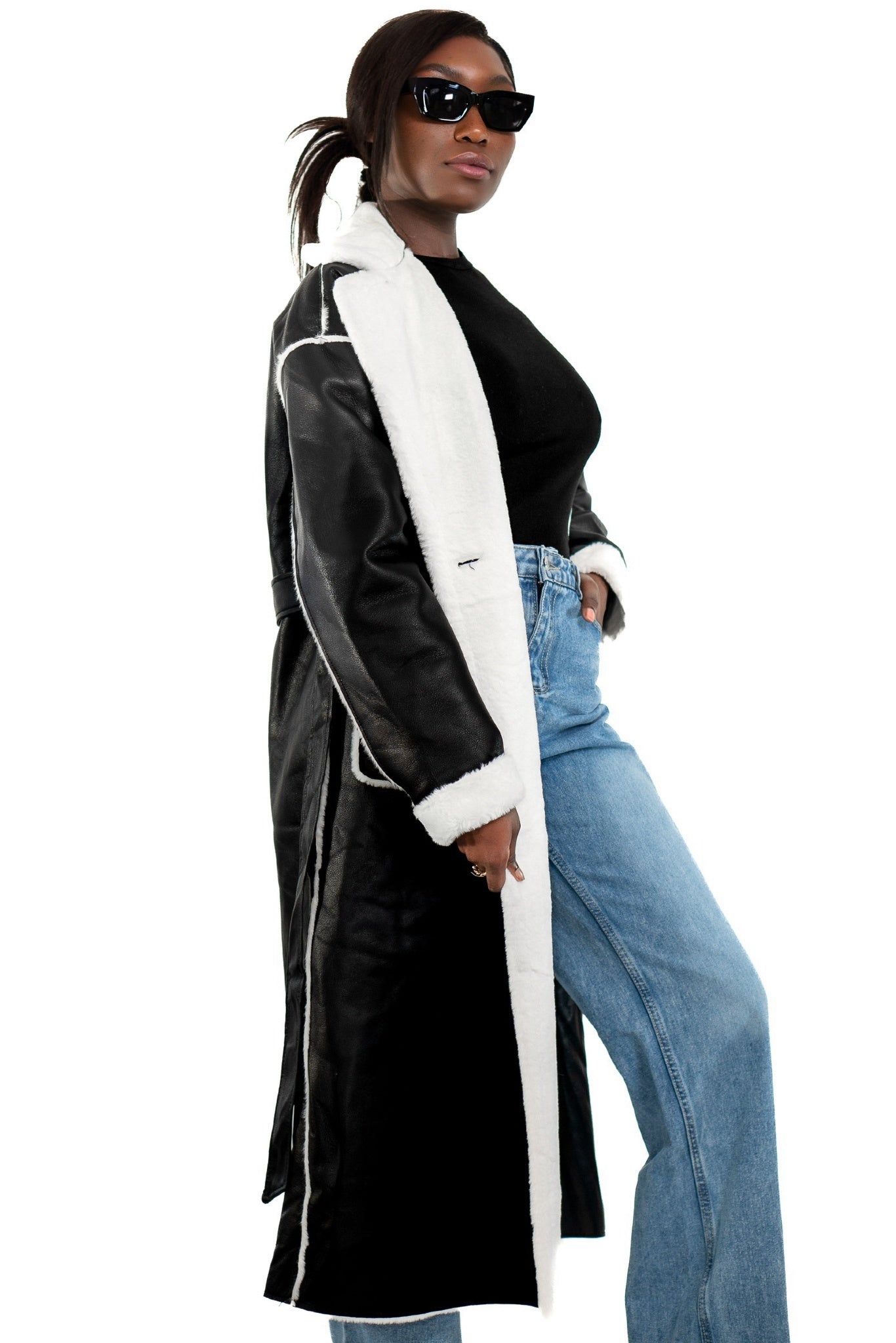 Ce manteau long en simili cuir noir, orné de détails contrastants en fausse fourrure blanche allie style intemporel et confort. Que ce soit pour vos sorties en ville ou une escapade hivernale, ce manteau deviendra votre allié incontournable pour l’hiver