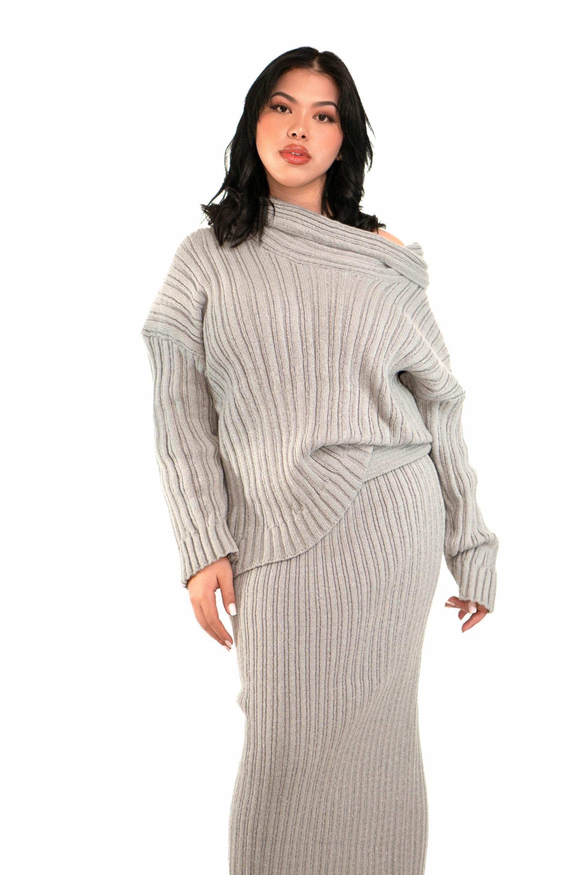Ensemble jupe et pull en coton, cet ensemble est composé de d’un pull oversize à épaule dénudées et d’une jupe longue ajustée, est le parfait mélange de style et confort. Ajoutez une touche de sophistication à votre garde-robe hivernale avec cet ensemble.