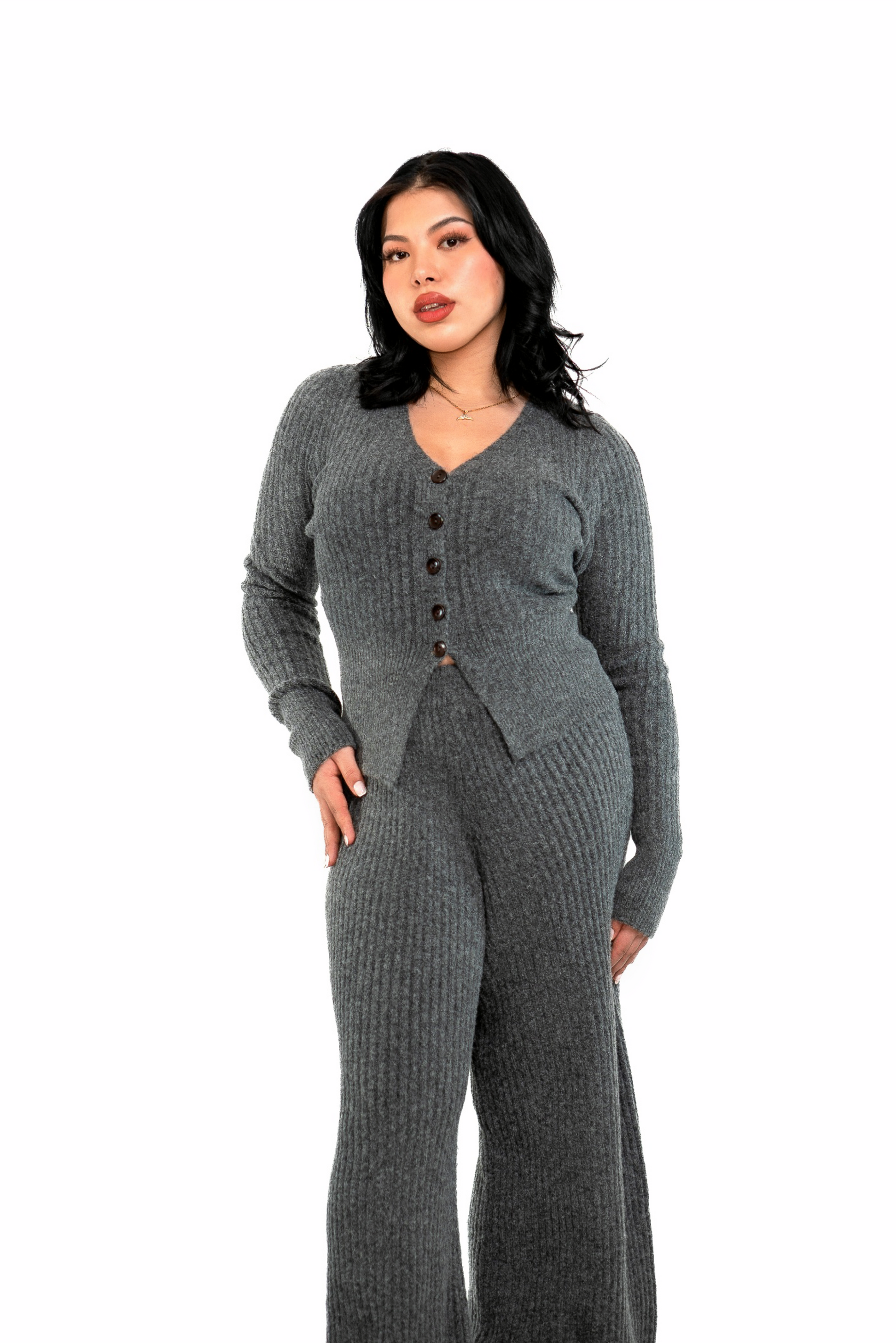 Ensemble gris en coton très confortable avec un pantalon large, et un haut en pull cardigan en V parfait pour une sortie décontractée.